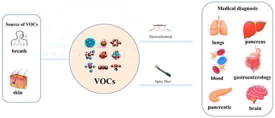 Exhaled breaths serve as a rich source of biological information, encompassing indicators that reflect metabolic status [1], biological rhythms, and early signals of certain diseases [2,3,4,5,6]. Human breath harbors in excess of 3500 volatile organic compounds (VOCs) [7], some of which are considered to possess the potential to function as biomarkers for various diseases [8,9,10,11,12]. Acetone is strongly associated with diabetic ketoacidosis (DKA), and its concentration in exhaled breath is significantly elevated (75 ppm–1200 ppm), making it a potential biomarker for non-invasive diagnosis. Ethanol is associated with liver disease, and changes in the concentration of its metabolites (e.g., acetaldehyde) in exhaled breath can be used to assess liver function. Isopropanol is found at elevated concentrations in the exhaled breath of patients with certain cancers (e.g., lung cancer) and can be used for early screening. Methanol correlates with the activity of the gut microbiota and can be used to assess gut health. In the realm of metabolomics, biological samples, including exhaled breath, urine, blood, and cerebrospinal fluid obtained from humans and animals, are rich in chemical, physical, and biological information, particularly VOCs [13,14,15]. Metabolites, intimately linked to the metabolic activities of organisms, are pivotal in the genesis and progression of diseases. Within the sphere of human metabolomics, exhaled breath and skin emerge as the predominant sources of VOCs, each contributing 54% to the total VOC profile. Feces, saliva, urine, and blood account for 15%, 14%, 11%, and 6% of the total VOCs, respectively [16]. Additionally, 84, 360, and 532 different exogenous and endogenous VOCs were detected in respiratory samples, saliva, and the skin, respectively [17,18]. As a result, VOCs have risen to prominence as potential biomarkers in the realm of disease diagnostics. The examination of VOCs in breath composition enables real-time monitoring of the human body’s metabolic status, leveraging its non-invasive and continuous monitoring characteristics, which eliminate the need for sample collection or processing. Breath analysis has demonstrated significant application potential in the field of clinical medicine [19,20]. In contrast to blood tests, the non-invasive characteristic of breath analysis not only alleviates the discomfort experienced by subjects but also offers several additional advantages [21], while also providing an effective means of continuously monitoring physiological changes in the human body [22]. As time progresses, gas sensor technology has advanced rapidly and has been widely applied in environmental quality testing [23,24], food safety testing [25,26], and health care [27,28,29]. This article focuses on the challenges and applications of this technology in the field of medical diagnostics (Figure 1).