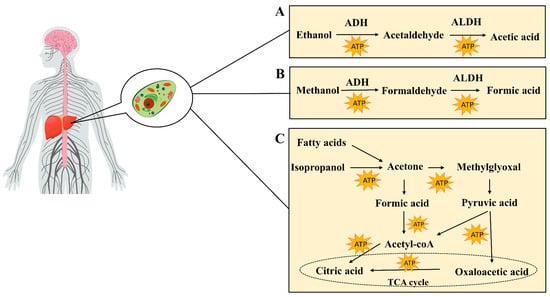 (A) Metabolism of ethanol in the liver, including oxidative metabolism into acetaldehyde and acetic acid. (B) Metabolism of methanol in the liver, including oxidative metabolism into formaldehyde and formic acid. (C) Sources of acetone (e.g., fatty acid beta-oxidation and isopropanol metabolism), along with its metabolic pathways.