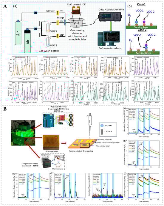 (A) Detection of VOC mixtures by a chemo-resistive bio-sniffer based on 2D CuO nanosheets. (a) Schematic diagram of the sensing setup utilized for analyzing binary mixtures of VOCs. (b) Illustrations of Case-1 and Case-2 within the Eley–Rideal mechanism. (c–l) Dynamic response maps for 10 binary mixtures of 5 VOCs at 300 °C. Reprinted from Ref. [74]. (B) Enhanced gas sensing performance of metal-oxide semiconductor chemo-resistors at room temperature using ultraviolet excitation. Transient optical responses of (a) SnO2, (b) In2O3, (c) ZnO, (d) WO3, (e) CuO, and (f) ITO under varying light intensities (1.1, 18.0, 36.4, 76.0 mW/cm2) during UV irradiation at 400 nm. Reprinted from Ref. [75].