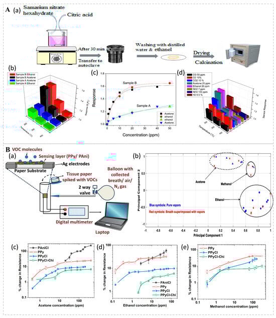 (A) (a) Schematic illustration of the synthesis process for Sm2O3 nanoparticles. (b) Sensor responses to acetone and ethanol across a range of operating temperatures from 300 to 400 °C. (c) Calibration curves for sensors A and B in response to low concentrations of ethanol and acetone at 300 °C. (d) Selective response of sensor B to various gases at 300 °C. Reprinted from Ref. [76]. (B) (a) Schematic diagram of the experimental setup for vapor sensing. (b) Principal component analysis (PCA) plots for various VOCs in their pure forms (blue symbols) and when superimposed with breath samples (red symbols), demonstrating distinct clusters for each VOC. Sensor responses to (c) acetone, (d) ethanol, and (e) methanol vapors. Lines are included for visual guidance. Reprinted from Ref. [77].