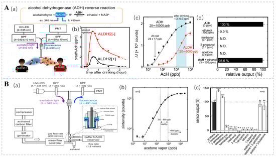 Fluorescence bio-sniffers possess the ability to detect signals based on a diverse array of fluorescence properties, encompassing fluorescence intensity, anisotropy, lifetime, emission and excitation spectra, fluorescence quenching, and quantum yield [88]. Acetaldehyde (AcH) is an intermediate product of ethanol metabolism, and Koji T. and his team used an ethanol bio-sniffer to detect acetaldehyde in exhaled gas using the reverse reaction of ADH. In this reaction, ADH reduces acetaldehyde to ethanol and consumes the coenzyme nicotinamide adenine dinucleotide (NADH). Given that NADH exhibits distinctive fluorescence at 490 nm upon excitation with UV light at 340 nm, the quantification of acetaldehyde concentration can be achieved by monitoring alterations in NADH fluorescence intensity (Figure 6A). This approach boasts high sensitivity and specificity, with a dynamic detection range spanning from 20 ppb to 10 ppm, thereby encompassing the acetaldehyde levels observed in both healthy individuals and post-alcohol consumption [89]. There is a correlation between the concentration of acetone in exhalation and the concentration of blood glucose [90]. In diabetic patients, acetone concentrations are markedly elevated compared to those in healthy individuals, with levels sometimes surpassing 900 ppb [91]. Consequently, the acetone present in exhaled breath is regarded as a prospective non-invasive biomarker for diabetes diagnosis. Ming Ye and colleagues engineered a graphene-based bio-sniffer utilizing NADH-dependent secondary alcohol dehydrogenase (S-ADH) [92]. Among these, the UV-LED excitation system stands out for its simplicity and compactness, low power consumption, and minimal heat generation. These features provide enhanced safety and controllability compared to conventional ultraviolet lamps. The fluorescence intensity was shown to be linearly correlated with acetone concentrations in the range of 20 to 5300 ppb (Figure 6B).