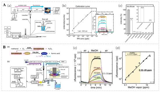 (A) (a) Diagrammatic representation of the isopropanol (IPA) bio-sniffer. (b) Calibration curve for the isopropanol (IPA) bio-sniffer. (c) Selectivity of the S-ADH evaluation by bio-sniffer. Reprinted from Ref. [99]. (B) (a) Measurement principle and (b) schematic diagram of the MeOH bio-sniffer. (c) Sensor responses to varying concentrations of MeOH vapor. (d) Calibration curve of the bio-sniffer for MeOH vapor. Reprinted from Ref. [101].