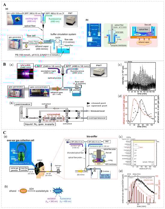 (A) Diagrammatic representation of an ADH-immobilized biosensor for ethanol vapor detection. (a) The experimental configuration of the ethanol biosensor, employing a UV light-emitting diode (UV-LED) for excitation. (b) An image of the biosensor and a schematic of the flow cell, which comprises an enzyme-coated membrane and an optical fiber probe. Reprinted from [104]. (B) Schematic representation of a skin ethanol vapor measurement system utilizing a bio-sniffer and a gas concentrator. (a) System for measuring skin gas with a gas concentrator. (b) Internal structure of the gas concentrator and the flow path during concentration. (c) Signal corresponding to ethanol in skin gas detected at the wrist using the skin gas measurement system. (d) Ethanol concentrations in skin gas derived from peak values and ethanol concentrations in exhaled air, determined using a gas detector tube. Reprinted from Ref. [105]. (C) (a) Schematic diagram of the monitoring system for ethanol derived from the external ear. The system consists of an over-ear gas collection cell and a bio-sniffer. (b) Principle of ethanol measurement utilizing ADH and NADH. (c) Relative sensor output in response to representative VOCs found in the breath. (d) Monitoring of ethanol concentration in ear gas following alcohol consumption with the developed system for subject 1. Symbols represent ethanol concentration in ear gas (●) in the breath, measured by detector tubes (Δ) and by the ethanol bio-sniffer (bars). Reprinted from Ref. [106].