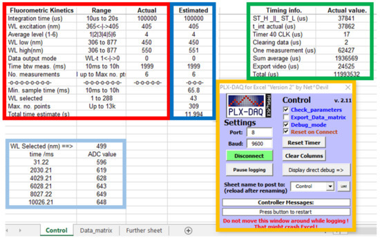 There are some interrelationships between some input parameters, and efforts have been made to maintain the maximum performance of the device (memory, time, WL). Thus, the number of kinetics points is limited by the number of WLs stored up to a maximum of 25kB. The minimum kinetic time interval is limited by the time required to operate the CA12880MA. Therefore, once the input parameters are typed in the Excel cells, it is necessary to recheck their values to verify that all device limits are matched (blue frame in Figure 2). Thus, the number of WLs to be stored is estimated from the available memory. The minimum sampling time (in milliseconds) is estimated from the internal timer values (in microseconds) with a 5% increment for safety. The exact time at which the first spectrum is recorded corresponds to half the integration time of the first measurement (see a detailed description in Supplementary Materials).