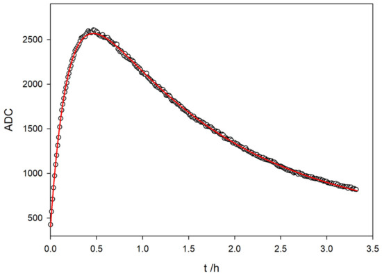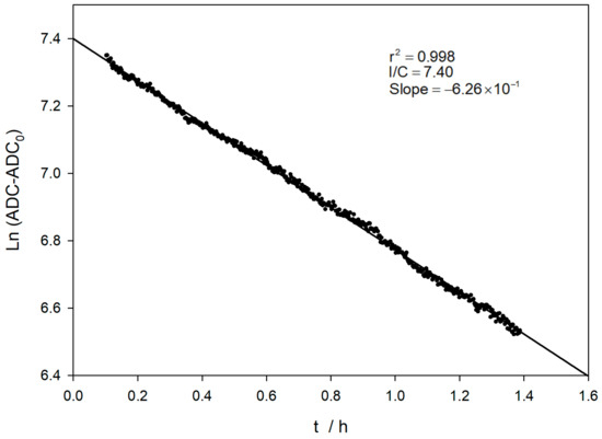 The experimental conditions applied imply that the TM oxidation reaction takes place under pseudo-first-order conditions, since the oxidant concentration is two orders of magnitude higher. At the initial reaction stages, a pseudo-first-order kinetics condition can yet be considered applicable, and a logarithmic linear relationship between the ADC value and time can be obtained, as shown in Figure 6. The evolution of the TM oxidation reaction is followed until total consumption. A sampling time of 5 s is used, and the excitation source is switched off between measurements. This avoids the possible decomposition of TC by the UV excitation light during the lengthy measurement period. A first estimation of the apparent rate constant can be obtained by the slope of the linear relationship (red line in Figure 6), obtaining a value of 6.72 × 10−3 s−1.