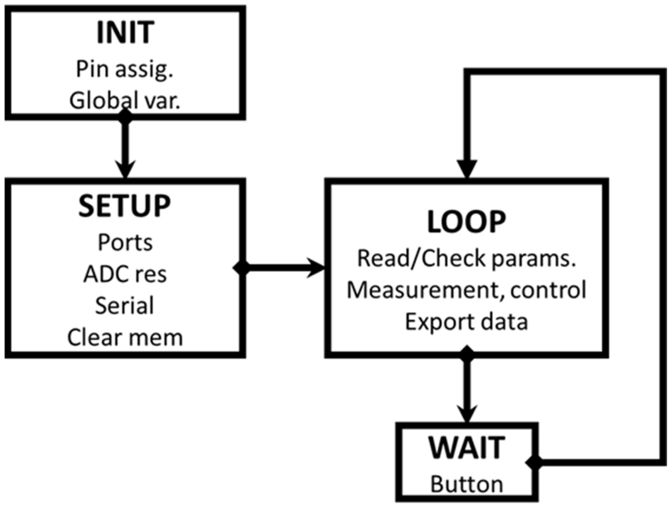In addition to the usual code for microcontroller programming, setup and loop, several routines have been developed to efficiently perform each experiment. The most important ones are listed here (more detailed information can be found in the Supplementary Materials).