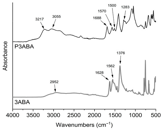 FT-IR spectra of 3ABA (3-aminobenzoic acid) monomer and P3ABA (poly(3-aminobenzoic acid).