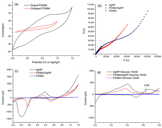 (a) CV of doped P3ABA (using as electrolyte support HCl 0.1 mol L−1) and undoped P3ABA (using as electrolyte support NaOH 0.1 mol L−1). (b) Electrochemical impedance spectroscopy (EIS) of P3ABA in HCl (doped state) and in NaOH (undoped state). (c) CV of P3ABA, AgNP, and P3ABA/AgNP composite in 0.10 M NaOH. (d) CV voltamogramms of AgNP, P3ABA and P3ABA/AgNP composite upon the addition of 5mM glucose. All voltammograms were obtained at a scan rate of 100 mV s−1 in the potential range of −0.40 to 1.0 V.