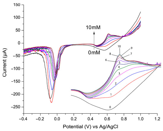 Linear sweep voltammetry (LSV) is a widely used technique for detecting and quantifying analytes in electrochemical sensors due to its ability to measure current changes associated with oxidation or reduction reactions [27,38]. During the LSV experiment, the potential applied to the electrode increases linearly over time, and the resulting current is recorded. Figure 4 presents the LSV plot used to evaluate the electrocatalytic activity of the P3ABA/AgNP composite toward glucose oxidation. In this experiment, the glucose concentration varied from 0 to 10 mM, increasing by 1 mM for each addition, with the LSV recorded after each step. As shown, the current peak at approximately 0.7 V increased proportionally with glucose addition. This peak corresponds to the oxidized product of glucose. At lower glucose concentrations the signal at this potential is broader and less defined. This may be attributed to the slower formation of oxidation intermediates (e.g., gluconolactone, gluconate) and the incomplete coverage of the nanoparticle surface by glucose, leading to heterogeneous reactions and a diffuse signal. Conversely, at higher glucose concentrations the catalytic sites are more effectively utilized, resulting in a sharper and more defined signal. The other observation is that as the glucose oxidation signal increases, the signal of silver reduction (observed between −0.1 and 0 V) diminishes. This phenomenon is believed to result from active site competition, surface blocking by glucose oxidation products, and the consumption of oxidized silver species during glucose oxidation.