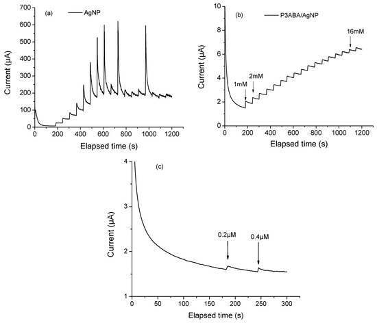 Chronoamperograms of (a) AgNP, (b) P3ABA/AgNP composite increasing the glucose concetration of 1 mM with each addition and (c) P3ABA/AgNP composite increasing the glucose concetration of 1 µM with each addition. All measurments were collected using NaOH 0.1 M as supporting electrolyte, applying a constant potential of 0.7 V.