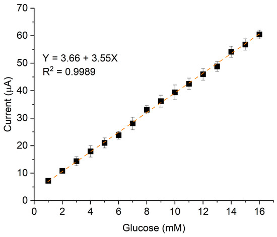 The linear dynamic range, which defines the concentration range over which the signal remains proportional to the analyte concentration, was from 1 to 16 mM. This linearity is represented by the calibration curve in Figure 7, which plots the current variation as a function of analyte concentration.