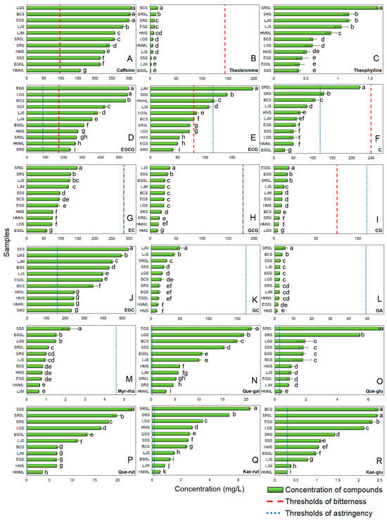 The concentration and perceived thresholds of bitter and astringent compounds (A) Caffeine; (B) Theobromine; (C) Theophylline; (D) EGCG; (E) ECG; (F) C; (G) EC; (H) GCG; (I) CG; (J) EGC; (K) GC; (L) GA; (M) Myr-rha; (N) Que-gal; (O) Que-glu; (P) Que-rut; (Q) Kae-rut; (R) Kae-glu in model samples. (Error lines were based on standard deviation; ‘a–k’ referred to the significant differences between the groups were determined by one-way ANOVA analysis based on Duncan’s multiple range test at p ≤ 0.05.).