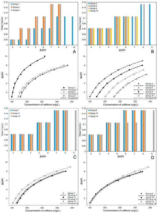The goodness of fit (R2) and adjusted R2 of the other groups were greater than 0.99, and the standard error of estimate (SEE) and residual sum of squares (RSS) were less than 0.3, indicating that a high level of curve fitting and predictive accuracy. However, in this study, the Weber fraction increased with BAIPI values (Figure 2A–D), indicating reduced perceptual sensitivity at higher BAIPI levels. This phenomenon also appeared in the study to determine the human sweetness and sourness interactive response [22]. This could be attributed to the interactive effect of the two sensations, resulting in alterations to the Weber fraction when the intensity of stimulation surpassed a certain threshold [7,22,24,39]. Equation (2) conformed to the complete form of Fechner law [39], which indicated that the interactive perceived intensity of the two sensations (e.g., bitterness and astringency) conformed to the Weber–Fechner law.