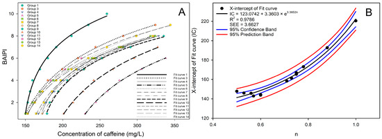 Figure 3A shows the BAIPI value points and fit curves of all groups, and it was found that the fit curve gradually shifted to the right with the increase of n in general. This phenomenon appeared due to the gradual increase of n from 0.5 to 1.0, where the molecular quantities of caffeine and EGCG approached stoichiometric equilibrium. Under these conditions, caffeine and EGCG preferentially formed 2:2 heterotypic complexes [40]. These complexes competitively inhibited EGCG’s binding affinity for salivary proteins, thereby attenuating astringency perception [41]. To maintain equivalent BAIPI values, compensatory elevation of total caffeine concentration (x) became requisite to achieve parity in overall sensory stimulation. The X-intercept, as an approximate indicator of the position of the fit curve on the X-axis, was used to conduct a correlation analysis with the n of all groups as shown in Figure 3B. It was found that the correlation fitted into exponential curves, and the equation form was as follows: