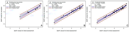 The applicability of the BAIPI quantification curve was assessed through correlation analysis between calculated and directly assessed BAIPI values (Figure 6). The concentration of caffeine, EGCG, and Que-rut of green tea samples were input into Equations (6) and (14)–(16) calculated the corresponding a, b, c and IV. These parameters were then substituted into Equation (17) to calculate final BAIPI values (Table 11). Direct assessment of BAIPI values was based on a 9-point intensity scale (1 = lowest, 9 = highest). Scale reference points corresponded to the concentration of caffeine, EGCG, and Que-rut corresponding to the BAIPI values of 1, 3, 6 (in Group 14), 9, 12, 15 (in Group 6), 18, 21 and 24 (in Group 1) in Table 10. In Figure 6, the R2 of the correlation model based on the model, validation and all samples were 0.9475, 0.9418 and 0.9439, respectively, and SEEs were 1.4537, 1.5865 and 1.5099, respectively. These results demonstrate the model’s ability to reliably estimate the comprehensive bitter–astringent perception in green tea.