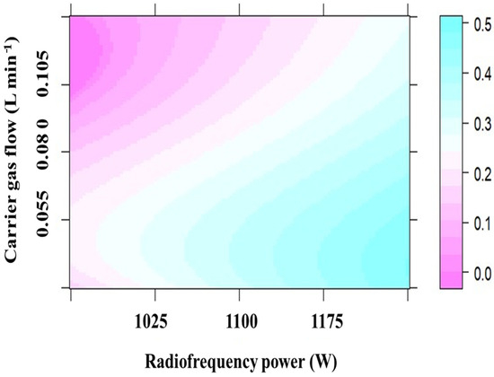 The desirability function was used for multiresponse optimization (Figure 2). A desirability function transforms the values of a response from 0 to 1, where 0 stands for an unacceptable value of the response and 1 for desirable values [24]. The individual desirability values were 0.785 for Hg and 0.365 for Pb, and the overall desirability was 0.535. Although the desirability of Pb was lower than 0.5, all desirability values were within the acceptable range, and the optimal conditions were achieved at an RF power of 1310 W and a carrier gas flow rate of 0.035 L min−1. These values were expected, as high carrier gas flow rates in PVG can cause the transport of droplets into the ICP and cooling of the inner region of the plasma.