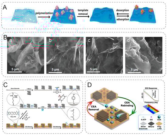 Hadian et al. prepared a nano-constrained MXene-modified bionic sensor for the quantitative and label-free detection of Carcinoembryonic antigen (CEA). They modified disposable silver electrodes with Ti3C2Tx MXene and immobilized CEA on the surface using SAM (4-ATP) and glutaraldehyde (GA). MIP structures were prepared by electropolymerization of o-phenylenediamine (o-PD), and then proteins were extracted from the structures using an appropriate alkaline washing solution (Figure 1C,D). The nano-microcavities between the MXene nanoparticles create suitable sites for the attachment of the SAMs to the silver surface, providing a limited space for the trapping of the solution and analytes. Its integration with MIPs improves electrochemical biosensor performance []. Therefore, MXene can be used for electrochemical sensing of biomolecules and pathogens, making it one of the most promising 2D materials.