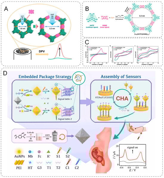 Two-dimensional conductive metal–organic frameworks (2D c-MOFs) with large pore sizes can be engineered through a ligand insertion strategy, wherein a linear ligand is incorporated into the framework, replacing the metal ion with a linear -M-ligand- unit. Leveraging this strategy, Wang et al. expanded upon the initially reported 2D conductive metal–organic framework (2D c-MOF), Cu3(HHTP)2, by incorporating the linear ligand 2,5-dihydroxybenzoquinone (DHBQ) to synthesize 2D c-MOFs featuring a mesopore size of 3.2 nm (Figure 2B,C). These materials were subsequently used to modify electrodes (Figure 2A), enabling the detection of several biologically significant molecules, including 5-hydroxytryptamine (5-HT), uric acid (UA), and caffeic acid (CA). The findings revealed that at a relatively high scan rate of 100 mV s⁻1, the current signals for all three analytes measured with the Cu3(HHTP)(DHBQ)1.53− modified electrode were substantially more pronounced compared to those obtained with bare glassy carbon electrodes (GCEs) and Cu3(HHTP)2-coated GCEs. This underscores the superior electrochemical activity of the Cu3(HHTP)(DHBQ)1.53− framework []. Furthermore, MOFs are inherently multifunctional and amenable to functionalization. They can concurrently perform catalytic, sensing, and adsorption roles, making them exceptionally suitable for diverse electrochemical detection applications. Additionally, their versatility allows for the introduction of specific functional groups, which further augments their capability to recognize and detect target molecules effectively []. These properties of MOFs make them widely applicable in the field of electrochemical biosensors. Ma et al. modified the MOF materials to prevent the leakage of MB/Fc in MOF and reduce the energy loss during electron transfer, thus improving the sensitivity and accuracy of detection []. The innovativeness of this study is reflected in the precise anchoring of gold nanoparticles (AuNPs) to the porous MOF surface through a polyethyleneimine (PEI)-mediated self-assembly strategy. Based on the directed modification technique of Au-S bonds, the research team successfully grafted guanine-enriched sequences to the AuNPs interface and achieved stable encapsulation of methylene blue (MB)/ferrocene (Fc) molecules through conformational restructuring of G-quadruplex (G-quadruplex). The material is capable of early identification of β-thalassemia-associated polygenic mutations (Figure 2D). Furthermore, by adapting the template, the technique can be extended to detect other disease-related mutations.