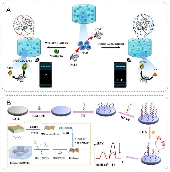 Seul Gi Kim et al. developed an innovative electrochemical biosensor designed for the precise detection of acetylcholinesterase (AChE) and its activity, leveraging the redox-responsive properties of carbodiselenide crosslinked polymer dot-loaded polydopamine (PDA@dsPD) embedded within a polyvinyl alcohol (PVA)/chitosan matrix. During the redox reaction, the diselenide bonds within the PDA@dsPD break down, releasing PDA, which simultaneously alters the electrical and optical properties of the hydrogel (Figure 3A). Furthermore, the biosensor can be integrated with a wireless device, enabling real-time monitoring of AChE levels and facilitating the rapid generation of accurate results []. Geng et al. fabricated MXene nanosheets with a large surface area to serve as the conductive framework for the anti-fouling hydrogel, incorporating a significant amount of [Ru(NH3)6]3+ onto the nanosheets (Figure 3B). To further enhance the stability and conductivity of the anti-fouling hydrogel and expand its applicability in electrochemical analysis, KH570 and PEDOT:PSS were introduced. Additionally, the encapsulated [Ru(NH3)6]3+ acted as a correction factor to improve the biosensor’s detection accuracy. The developed biosensor demonstrated excellent sensitivity and precision in detecting carcinoembryonic antigen (CEA) in human serum, enabling the trace-level detection of biological targets in serum samples [].