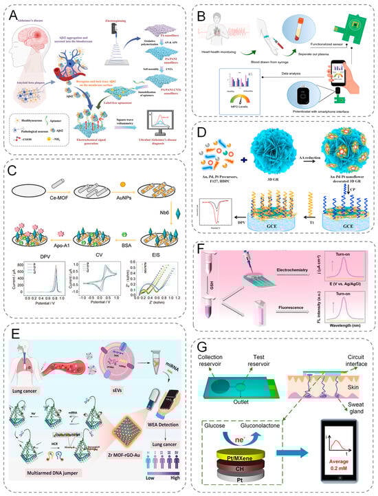 (A) Schematic representation of PA/PANI-CNTs-based electrochemical biosensors for the early diagnosis of AD through simple and low-cost rapid detection of A β 42 in human blood. (B) Illustration of sample acquisition and testing using functionalized printed circuit board (PCB) sensors and schematic diagram of the PCB electrode functionalization and modification process. (C) Schematic diagram of the assembly process of Ce-MOF@Au-Based electrochemical sensor, and electrochemical behavior. (D) Schematic diagram of the principle of electrochemical signal generation by CRISPR/Cas9-triggered ESDR based on 3D GR/AuPtPd nanoflower biosensor. (E) Schematic diagram of electrochemical analysis of small extracellular vesicle-derived microRNAs (sEV-miRNAs) for lung cancer diagnosis. (F) Dual-mode, turn-on electrochemical and fluorescence sensing proto-schematic of GSH. (G) Schematic of sweat collection and glucose testing using wearable devices.