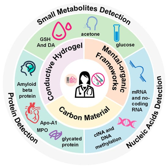 Fluctuations in biomarker concentrations (presence, absence, or quantitative variations) within biological specimens serve as critical indicators for tracking pathological progression. Biomarkers can be categorized as diagnostic, prognostic, and predictive []. Prognostic biomarkers provide information about the course of disease recurrence. Predictive biomarkers estimate the response to treatment. Diagnostic biomarkers are associated with the detection of diseases. This article focuses on diagnostic biomarkers. Biomarkers encompass a diverse array of molecules including proteins, nucleic acids, and small metabolites. The monitoring of these parameters requires a fully equipped laboratory or clinic. Countries and regions with relatively poor economic development have inadequate medical equipment, which makes early diagnosis inadequate. Therefore, the development of low-cost, convenient, and highly sensitive POC monitoring devices has become necessary for the early detection of disease and the effective management of the disease. Among the many methods, electrochemical biosensors are of interest because of their high sensitivity, fast analysis, and low cost. Recent advancements in analytical characterization and high-specificity electrochemical detection of biomarkers have significantly enhanced clinical capacity for early-stage disease diagnosis.