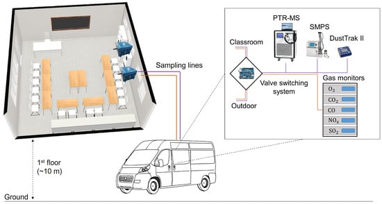 The measurements started on 29 January (Monday) and lasted for three school weeks, until 16 February (Friday) of 2024. All reference instruments were used for both indoor and outdoor measurements. The instruments alternatively sampled indoor and outdoor air using a valve-switching system (Figure 1). Two sampling lines, a Teflon one for gasses and a copper one for particles [51], connected the classroom with the instruments in the FORTH mobile laboratory for indoor measurements. There were two additional sampling lines for the outdoor measurements. Changing between indoor and outdoor measurements was controlled by two automated switching three-way Swagelok valves, one for the gasses and one for the particles. The automated switching was controlled by a Pololu Maestro Servo Controller. During school hours, between 8:00 and 15:00, we sampled for 80 min indoors and then 20 min outdoors, while during non-school hours, we sampled for 20 min indoors and then 80 min outdoors.
