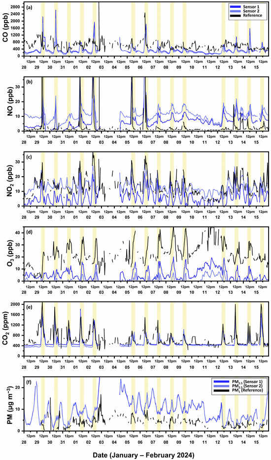 Time series of sensors’ and their references’ hourly concentrations in the classroom using factory calibration: (a) CO, (b) NO, (c) NO2, (d) O3, (e) CO2, and (f) PM.