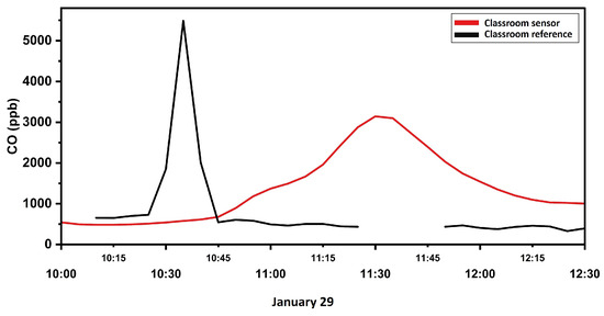 On 29 January, at 10:30, the mobile laboratory (van) was started (cold start), and the indoor CO concentration increased to 5500 ppb according to the reference instrument. The low-cost sensor did not respond to this 5–10 min elevated concentration (Figure 3).