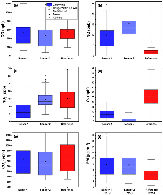 Boxplots of sensors’ and their reference’s hourly concentrations in the classroom. Sensor measurements are factory-calibrated: (a) CO, (b) NO, (c) NO2, (d) O3, (e) CO2, and (f) PM. The symbols are the corresponding average values.