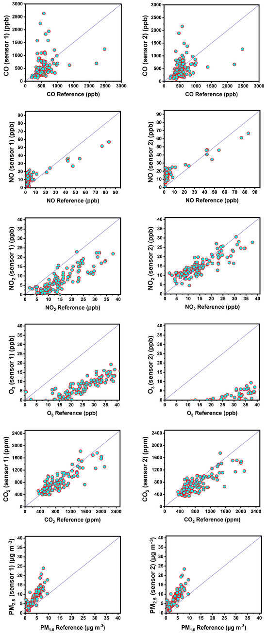 The electrochemical sensors’ manufacturer (Alphasense Ltd., Essex, UK) provides equations to translate the electronic signal from each sensor to pollutant concentration values. These equations are different for each sensor, and they include the sensor’s working electrode (WE) electronic zero (WEe), auxiliary electrode (AE) electronic zero (AEe), WE zero (WE0), AE zero (AE0), and sensitivity (S).