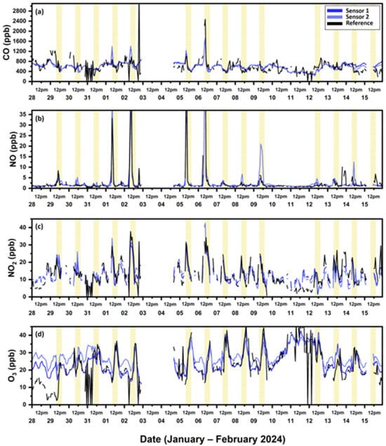 Time series of ML-calibrated sensors’ and their reference’s hourly concentrations in the classroom: (a) CO, (b) NO, (c) NO2, and (d) O3.