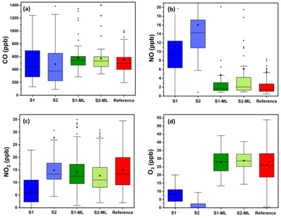 Boxplots of factory-calibrated sensors 1 and 2, ML-calibrated values, and their reference’s hourly concentrations in the classroom: (a) CO, (b) NO, (c) NO2, and (d) O3.