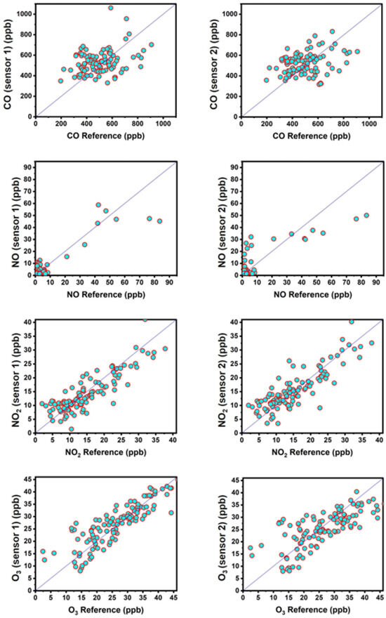 Using 8 h averaged data (08:00–16.00), the first sensor exhibited a ME of 17 ppb (72%) and the second 25 ppb (110%) when compared to the reference instrument. Both sensors underestimated the actual concentrations (Figure 4 and Figure 5).