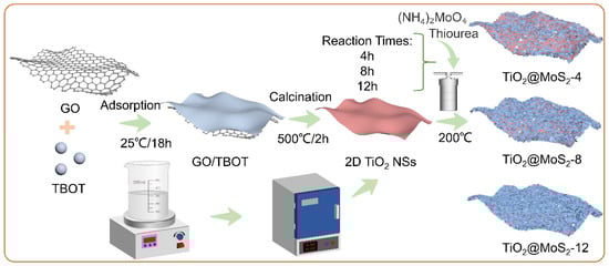 Synthesis of TiO2@MoS2 Nanocomposites: 0.1 mmol of ammonium heptamolybdate tetrahydrate (NH4)2MoO4·4H2O) was dissolved in 10 mL of deionized water under vigorous stirring. A predetermined amount of the as-prepared TiO2 nanosheets was added to the solution, and the mixture was incubated at room temperature for 12 h and dried at 80 °C for 12 h. Separately, 0.1 mmol of (NH4)2MoO4·4H2O and 3.05 mmol of thiourea (CH4N2S) were dissolved in 40 mL of deionized water. The (NH4)2MoO4·4H2O-loaded TiO2 nanosheets were then added to the solution, and the mixture was stirred at room temperature for 1 h. The homogeneous suspension was transferred to a 50 mL Teflon-lined stainless-steel autoclave and heated at 200 °C for 8 h. After cooling to room temperature, the black precipitate was collected, washed three times with deionized water and ethanol, and dried at 60 °C overnight to obtain TiO2@MoS2-8 nanosheets. By adjusting the reaction time to 4 h and 12 h under identical conditions, samples labeled TiO2@MoS2-4 and TiO2@MoS2-12 were prepared. For comparison, pure MoS2 nanosheets were synthesized using the same procedure without the addition of TiO2 nanosheets.