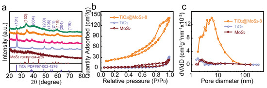 (a) XRD patterns of TiO2, MoS2, TiO2@MoS2-4 (pink line), TiO2@MoS2-8 (orange line), and TiO2@MoS2-12 (green line) samples; (b,c) nitrogen adsorption–desorption isotherms and BJH pore size distribution of TiO2, MoS2, and TiO2@MoS2-8.