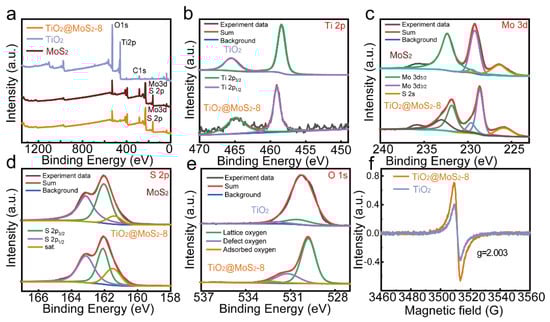 (a) X-ray photoelectron spectroscopy (XPS) survey spectra of TiO2, MoS2, and TiO2@MoS2-8; (b) high-resolution Ti 2p spectra of TiO2 and TiO2@MoS2-8; (c) Mo 3d spectra of MoS2 and TiO2@MoS2-8; (d) S 2p spectra of MoS2 and TiO2@MoS2-8; (e) O 1s spectra of MoS2 and TiO2@MoS2-8; (f) electron spin resonance (ESR) spectra of TiO2 and TiO2@MoS2-8.