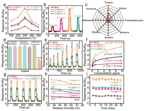 (a) Response (Ra/Rg) of MoS2, TiO2@MoS2-4, TiO2@MoS2-8, and TiO2@MoS2-12 to 10 ppm toluene across 200–280 °C; (b) response/recovery time; (c) selectivity toward 10 ppm toluene, xylene, benzene, triethylamine, acetone, methanol, ethanol, and ammonia; (d) gas responses to mixed vapors at 240 °C; (e) dynamic response curves for varied toluene concentrations (0.05–10 ppm) at 240 °C; (f) relationship between sensor response and toluene concentrations (0.05–10 ppm); (g) reproducibility over five cycles at 10 ppm toluene (240 °C); (h) humidity-dependent responses (25 °C, 25–75% RH); (i) long-term stability (30 days, 10 ppm).