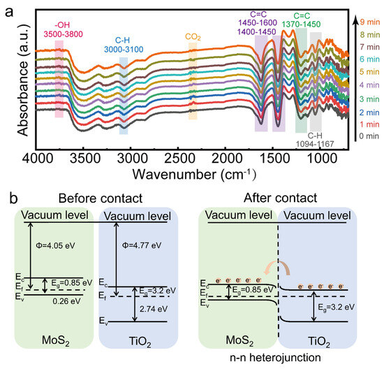 (a) In situ DRIFTS analysis of the TiO2@MoS2-8 nanocomposite during gas exposure; (b) band alignment diagrams illustrating the interfacial energy structure of TiO2 and MoS2 pre- and post-heterojunction formation.