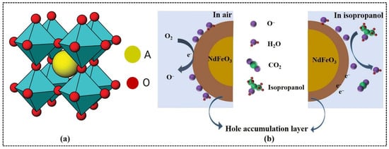 (a) Ideal cubic perovskite structure for ABO3 (cyan, BO6 units). (b) Gas-sensing mechanism of NdFeO3 sensor. (a) Reproduced with permission [43]. Copyright 2012, American Chemical Society. (b) Reproduced with permission [34]. Copyright 2022, Elsevier B.V.