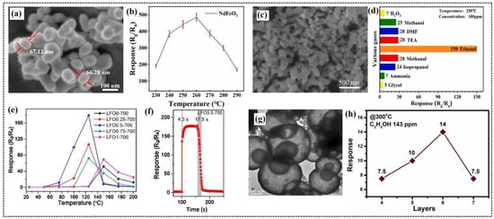 (a) Scanning electron microscopy (SEM) image of NdFeO3 nanoparticles. (b) Responses to 100 ppm of n-butanol at different operating temperatures from 230 to 290 °C. (c) High-resolution SEM image of NdFeO3 nano-coral granules. (d) Response of NdFeO3 sensor to different test gases (concentration of 100 ppm) at 250 °C. (e) Sensing responses of LFO0-700, LFO0.25-700, LFO0.5-700, LFO0.75-700, and LFO1-700 were detected under the temperature range from 25 to 200 °C toward 100 ppm of formaldehyde. (f) Response/recovery curves of LFO0.5-700 sensor to 100 ppm of formaldehyde at the optimal operating temperature. (g) Transmission electron microscopy (TEM) image of LFO-HS. (h) Response of x-layer (x = 4, 5, 6, or 7) LFO-HS gas sensors to 143 ppm of C2H5OH at 300 °C. (a,b) Reproduced with permission [37]. Copyright 2024, Elsevier B.V. (c,d) Reproduced with permission [62]. Copyright 2021, Elsevier B.V. (e,f) Reproduced with permission [8]. Copyright 2020, Elsevier B.V. (g,h) Reproduced with permission [63]. Copyright 2021, Elsevier B.V.