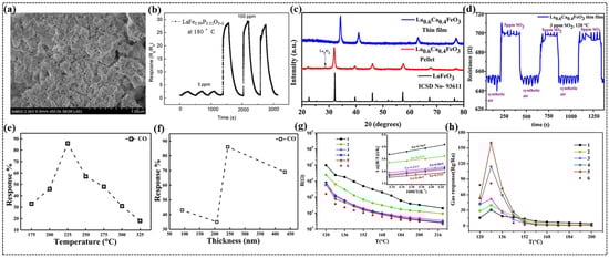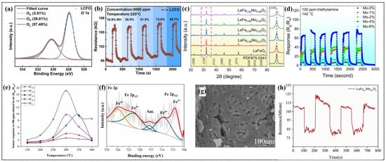 Shen et al. synthesized LaFeO3 nanoparticles with different Mo doping ratios to improve the triethylamine (TEA) gas-sensing performance [50]. XRD confirmed the lattice distortion due to Mo doping, which introduced defects and increased the number of active sites for gas–molecule interactions (Figure 4c). Morphological studies revealed a porous nanosheet structure with a large surface area that promoted efficient gas diffusion. Among the samples, 4% Mo-doped LaFeO3 demonstrated the best performance (Figure 4d), with a response approximately 11 times higher than that of undoped LaFeO3 at a relatively low operating temperature of 140 °C. In addition, the sensor exhibited fast response and recovery times of 12 and 59 s, respectively, with excellent selectivity, stability, and humidity resistance. The superior performance of the sensor was ascribed to a higher oxygen vacancy concentration of 4% Mo-doped LaFeO3 compared to other samples, promoting the adsorption of gas molecules on the surface of the sensor [92], thereby improving the gas-sensing performance.