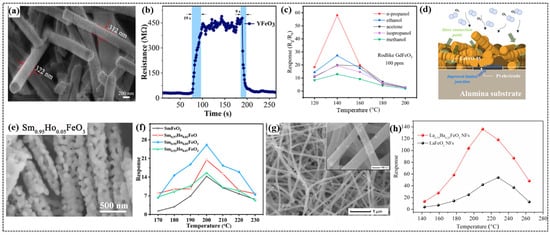 Sheng et al. investigated the potential of NdFeO3 nano-coral granules (Figure 2c), prepared via a solvothermal method, for detecting VOCs [62]. The sensor exhibited a response value of 150 to 100 ppm of ethanol (Figure 2d) with a response time of 19 s and recovery time of 22 s at 250 °C. The high specific surface area of the nano-coral granules provides more active sites on the material surface and promotes oxygen adsorption. Additionally, the porous structure of the sensor facilitates the easy diffusion of gas molecules through the interior of the material and enhances its sensitivity towards gas sensing. Yang et al. prepared ErFeO3 nanoparticles through a hydrothermal method followed by a calcination and an acidification procedure [65]. The rough surface of the nanoparticles played an important role in enhancing the sensitivity of the gas sensor [85]. This sensor exhibited optimal performance at 270 °C, demonstrating high sensitivity and repeatability for isopropanol detection, with a rapid response time of 6 s and a recovery time of 25 s at 100 ppm. The sensor also demonstrated remarkable sensitivity to isopropanol, exhibiting a response of 2.31 even at a low concentration of 2 ppm.