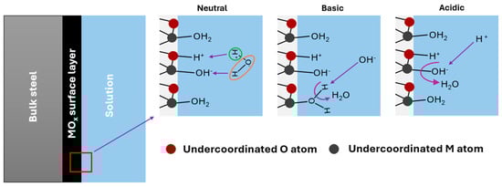 This is an updated understanding of the mechanism of pH measurement using this type of electrode. It is important to keep in mind that there is a simple theory based on the formation of a MOH layer when the electrode is immersed in water. In this case, the dissociative adsorption of a water molecule causes the formation of two surface –OH groups, due to the adsorption of the hydrogen atom on oxygen and the OH− on the metal atom of the surface oxide (Figure 2) []. These –OH groups are responsible for the surface ion exchange that causes potential variation in pH measurement, forming O− and –OH2+ groups depending on whether they give or accept H+.
