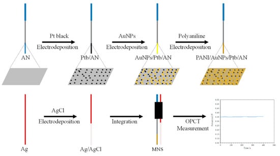 On the other hand, Ming et al. [] presented an implantable microneedle sensor for pH monitoring (MNS). A stainless steel acupuncture needle (AN) was used as the sensitive substrate to construct the sensor. A layer of platinum black and gold nanoparticles was prepared by electrodeposition and subsequently modified with polyaniline to increase the pH sensitivity. An Ag/AgCl reference electrode was prepared and integrated for the sensing system (Figure 3).