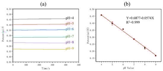 Figure 4 shows the calibration of the MNS. It can be noted that the OPCT decreases with the increasing pH of the solution (Figure 4a), yielding a calibration curve with a near-Nernstian slope value of −57.4 mV/pH (Figure 4b). This sensor demonstrated the ability to monitor pH in real time by analyzing buffer solutions and blood serum. In both cases, there was a minimal change in the potential with time for each pH value. The estimated pH response time was 420 s. Continuous in vivo pH monitoring was performed in rats by implanting the MNS in the main abdominal vein, demonstrating the functionality of the device for this application. The sensor response was selective to H+ ions in the presence of potential interferents Na+, K+, and Mg2+. In addition, the response was repeatable. After 7 days of storage of the sensor in serum, a decrease in the difference between the potential for pH 6 and pH 8 of 15.99% was caused, which the authors did not consider significant. Therefore, the sensor was found to be stable for continuous pH monitoring.