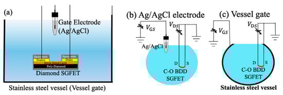 (a) Cross-sectional view of the C-O BDD SGFETs and the Ag/AgCl electrode in contact with a solution inside the vessel gate, (b) measurement schematic of the design with the Ag/AgCl electrode as a gate, and (c) measurement schematic of the design with the vessel gate. The blue colors represent a solution. Image taken from Kawaguchi et al. [] under the CC-BY 4.0 license [].