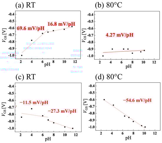 The sensitivities of the pH measurements for the system using the Ag/AgCl electrode as a gate are shown in Figure 6a for room temperature and in Figure 6b for 80 °C. The slope is high in the acidic medium but decreases in alkaline pH at room temperature. At 80 °C, however, the sensitivity drops sharply to 4.27 mV/pH over the entire pH range. The authors attribute this loss of sensitivity at high temperatures to an increase in the amount of activated boron, which reduces the effect of changes in the drain current caused by ions adsorbed on the surface due to changes in pH, ultimately resulting in a reduction in sensitivity. On the other hand, the sensitivity of the system using the vessel gate is shown in Figure 6c for room temperature and in Figure 6d for 80 °C. It is observed that at room temperature, the system becomes insensitive at acidic pH, with a slope of −11.5 mV/pH, increasing (in absolute value) to −27.3 mV/pH in alkaline medium. At room temperature, the sensitivity of the system is worse than when the Ag/AgCl electrode is used. The authors attributed the difference in the signs of the slope between the two systems to the fact that, in a sensing circuit, the direction of the surface dipole in the FET channel is the opposite of that of the vessel surface. Consequently, the effects of the ions on the two EDL capacitors of the FET channel and the vessel surface were opposite. At 80 °C, the system with the pH-sensitive vessel gate showed a slope of −54.6 mV/pH. At this temperature (353.15 K), the theoretical Nernst slope was −70.1 mV/pH, indicating that a system with 77.9% sensitivity was achieved.