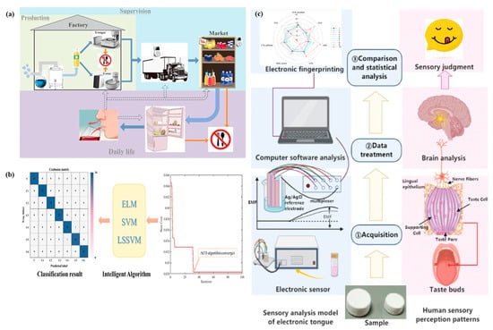 Applications of e-tongue and e-nose in food safety and quality control. (a) Comprehensive application of electronic tongue and nose technologies in food production, supervision, and daily life, covering the entire food supply chain from manufacturing to consumption [51]. (b) Graphical representation of e-tongue technology combined with multivariate analysis for advanced data interpretation and quality assessment [52]. (c) Comparative analysis of the human sensory system and the taste evaluation mechanism of the electronic tongue [53].