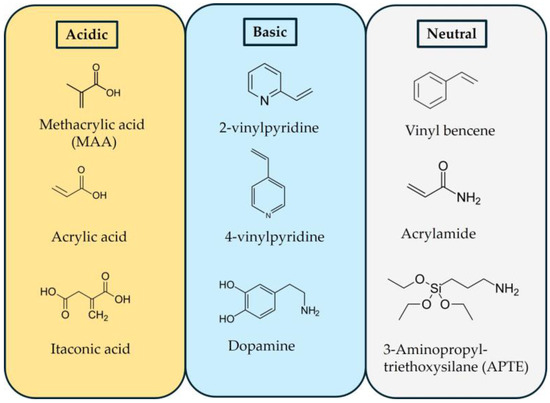 The key feature of MIPs is their ability to selectively recognize and bind to the target analyte, even in the presence of other similar molecules. In the most used imprinting approach, established by Mosbach group [44], imprinting is based on the non-covalent bonding between the template and polymer network, and the MIP selectivity is due to the specific molecular interactions between the template molecule and the polymer matrix, such as hydrogen bonding, van der Waals forces, or ionic interactions. As a result, MIPs can be designed to bind a wide range of molecules, including small organic compounds, peptides, proteins, nucleic acids, and even larger biomolecules, making them valuable in various fields such as environmental monitoring, pharmaceutical analysis, and medical diagnostics [45,46,47,48]. One of the major advantages of MIPs is their robustness and stability. Unlike biological recognition elements such as antibodies or enzymes, MIPs are not prone to degradation or denaturation, which makes them ideal for use in harsh conditions, such as extreme pH, temperature, or solvent environments [49]. Additionally, MIPs can be synthesized by inexpensive monomers, making them cost-effective alternatives to traditional recognition elements. They are also highly customizable, allowing for the tailoring of their binding properties by selecting appropriate monomers and cross-linkers. In Figure 1, the chemical structures of some typical functional monomers used for the fabrication of MIP via non-covalent approach are presented.