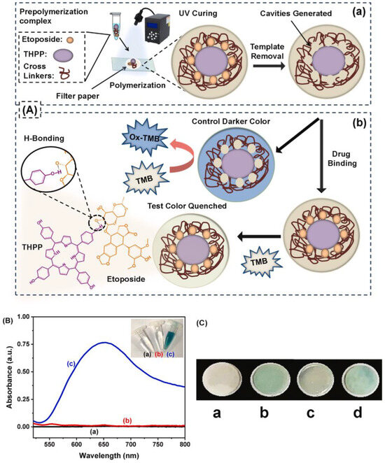MIP-based colorimetric sensors utilize the specific recognition between a target analyte and pre-formed imprinted sites within a polymer matrix. The distinguishing characteristic of these sensors is their ability to induce a measurable color change upon analyte binding, which can be monitored with simple optical techniques such as UV–visible spectroscopy [147].